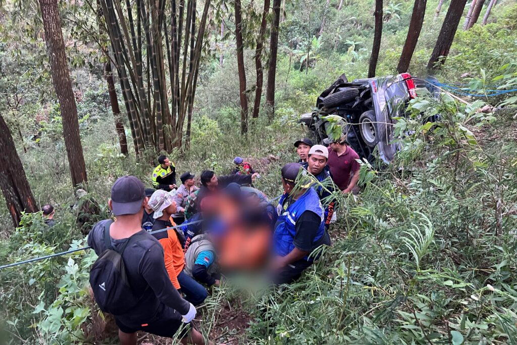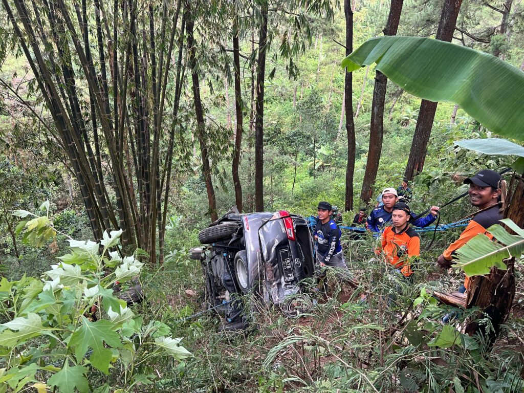 Asap tipis masih mengepul dari bodi mobil yang ringsek. Di atas tebing, warga dan relawan berlari-lari menuruni jalan curam dengan tali tambang di tangan. “Cepat! Ada korban masih bergerak!” teriak seorang relawan.