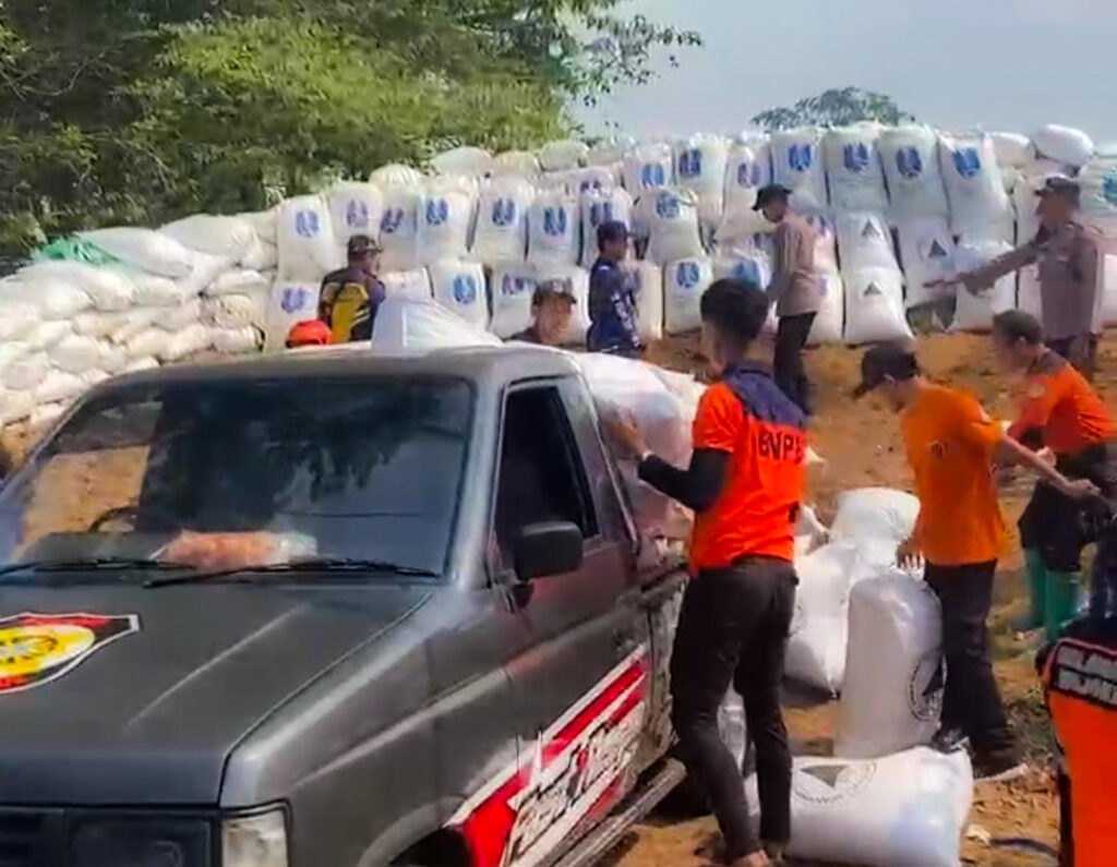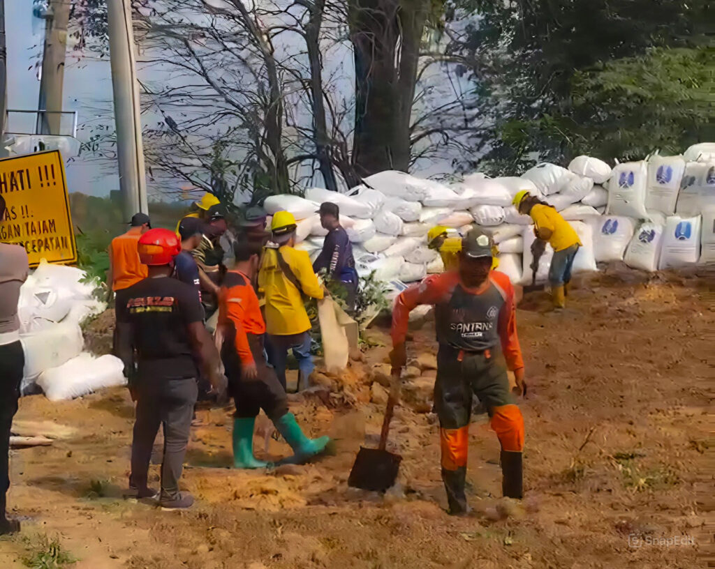 Pada Kamis (9/10/2025), para relawan kembali turun tangan melakukan revitalisasi benteng sekam. Ratusan karung baru dipasang menggantikan yang lapuk, memastikan jalur berisiko tinggi ini tetap aman dilalui.