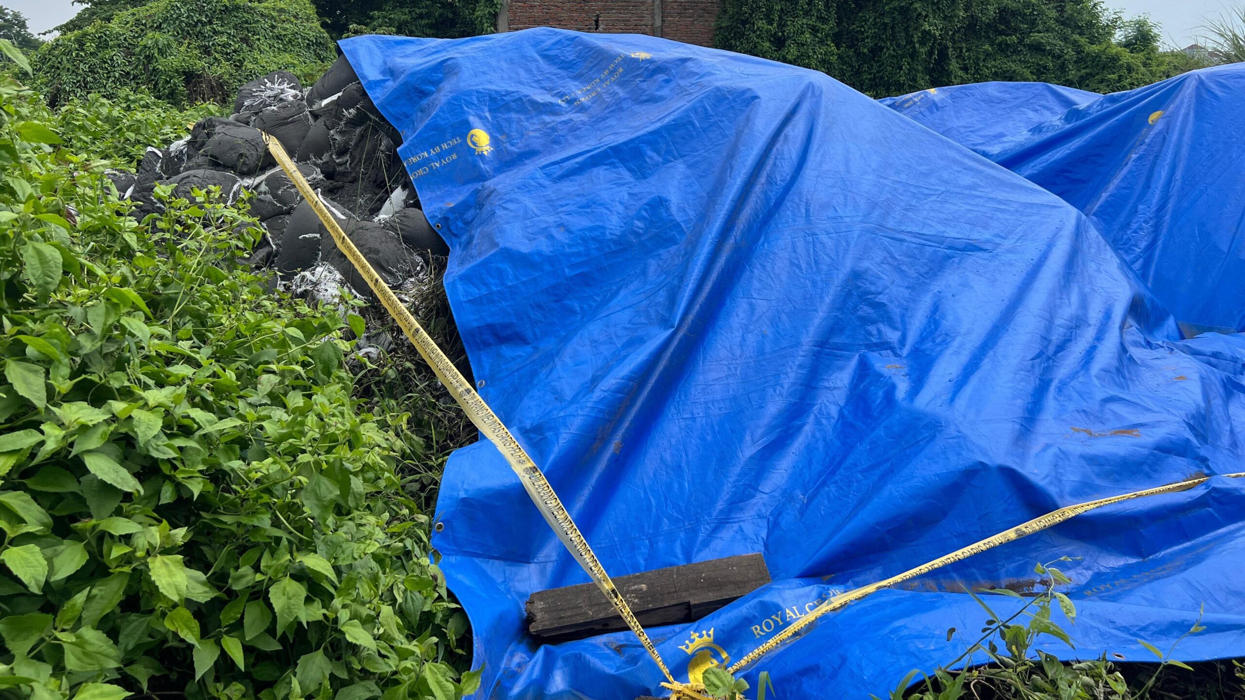 Foto 2 : Tumpukan karung yang ditutup terpal biru tampak di lahan terbuka Desa Bangun, Mojokerto. (Achmad Latifullah/Tunasnews.com)