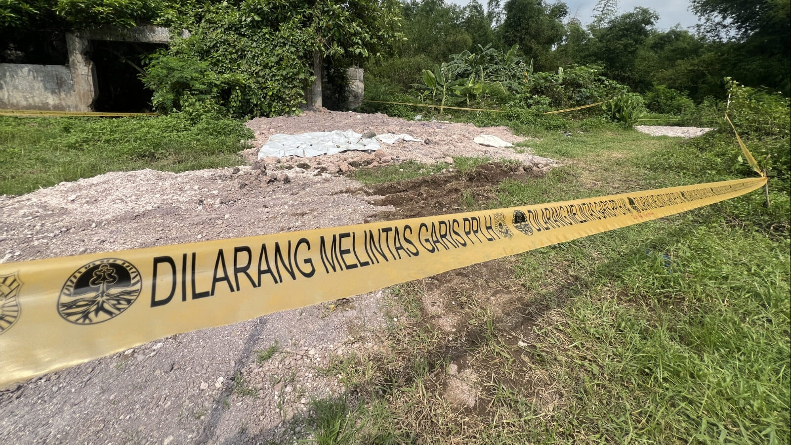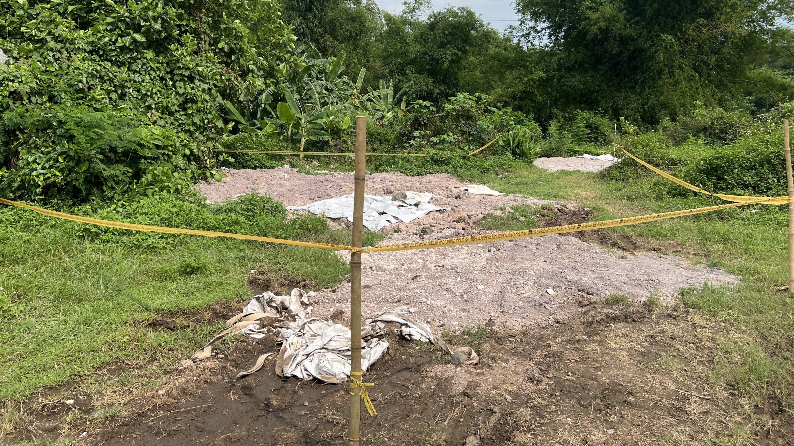 Foto 2 : Lokasi yang telah diberi garis pengamanan PPLH di kawasan Trowulan, Mojokerto. Material berwarna abu-abu di dalam area tersebut diduga limbah bahan berbahaya dan beracun (B3) (Achmad Latifullah/Tunasnews.com)